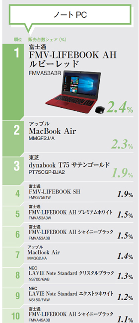 2017年4月のピックアップカテゴリは、「SIMフリースマートフォン」「ノートPC」「4Kテレビ」「レコーダー」「タブレット端末」「液晶ディスプレイ」の6つ。「ノートPC」の1位は、富士通の「LIFEBOOK AHシリーズ」の「FMVA53A3R」でした。15.6型ワイドフルHD液晶、オンキヨー製スピーカーを搭載したプレミアムモデルです。2月、3月に比べシェアはダウンしたものの、まだトップを維持しています。ノートPC