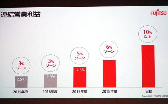 富士通の2017年3月期決算は売上高が4兆5096億円(前年度比95.2%)、営業利益が1288億円(106.8%)、純利益が884億円(102.0%)。田中社長は2015年6月の就任以来、「在任期間中に営業利益率10%以上」の達成を目標に掲げている。一昨年度の営業利益率は2.5%、昨年度は2.9%だったが、富士通では今年度の業績見通しで同4.5%としており、今年度大幅な収益性の改善を目指している。(BCN・日高 彰)