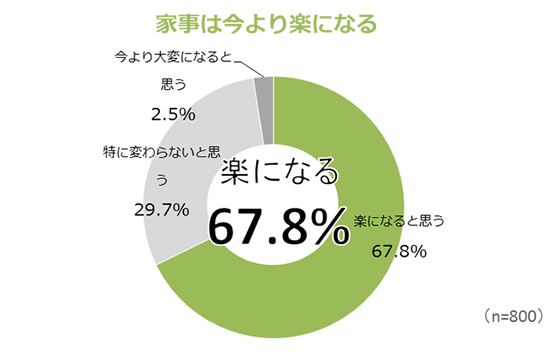 掃除は「ロボット掃除機」、食器洗いは「食洗機」、洗濯は「全自動洗濯乾燥機」で自動化でき、人が面倒と感じる家事だからこそ、いち早く自動化の技術が進んでいるとわかった。今後の家事予想に関しては、テクノロジーの進化やロボット化によって、67.8%は、「将来的に今より楽になる」と予想している。