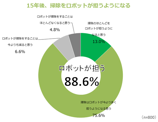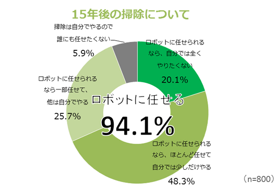 15年後の掃除についてきくと、88.6%が「一般家庭の掃除をロボットが現在よりも多く担うようになる」と回答。さらに、「自分では全くやりたくない」(20.1%)を含め、94.1%が「任せられるなら掃除はロボットに任せたい」と回答した。