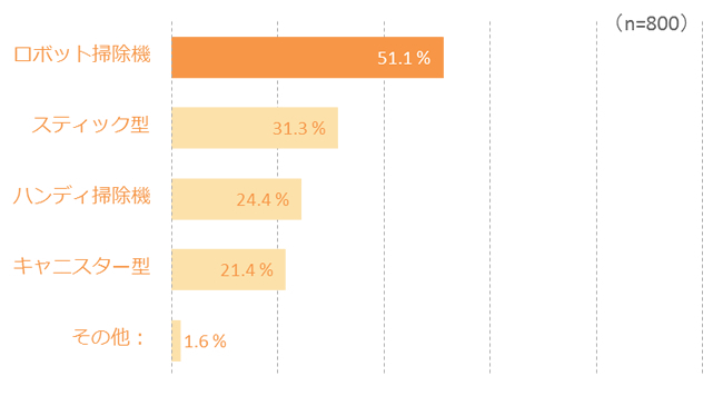 また、15年後に使っている掃除機の形状をきくと、ハンディやスティック型を上回り、約半数が「ロボット掃除機」を使用していると答え、ロボット掃除機は全世帯の5割以上に普及すると予想する人も、約6割、61.8%に達した。
