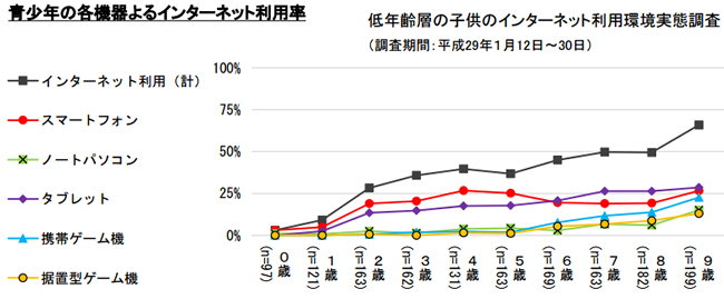 「低年齢層の子供のインターネット利用環境実態調査」は、0歳~満9歳の子どもの保護者2000名を対象に、調査員による訪問配布訪問回収(一部、ウェブ調査、郵送回収)を行い、1550名から回答を得た。回収率は77.5%。調査期間は2017年1月12日~1月30日。