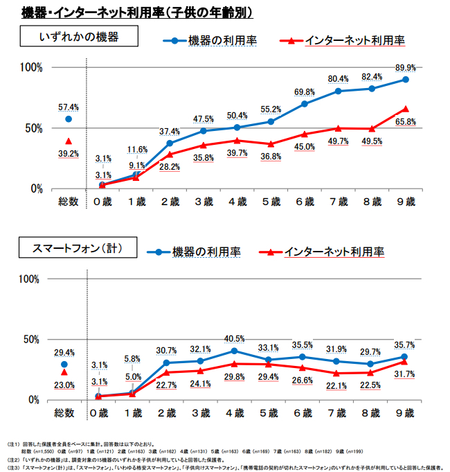 内閣府が0歳~満9歳の低年齢層の保護者を対象に、子どものインターネット利用状況を調査したところ、39.2%がいずれかの機器でインターネットを利用しているとわかった。利用率は年齢が上がるにつれて上昇し、6歳以降は4割を超え、9歳では65.8%に達した。