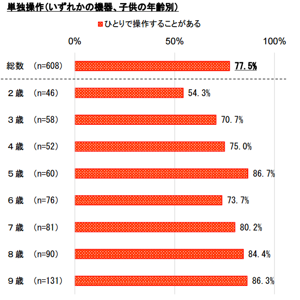 また、77.5%が子ども1人で操作することがあるといい、1人で操作する機器としては、携帯ゲーム機(88.4%)、携帯電話の契約が切れたスマートフォン(86.7%)が上位となった。
