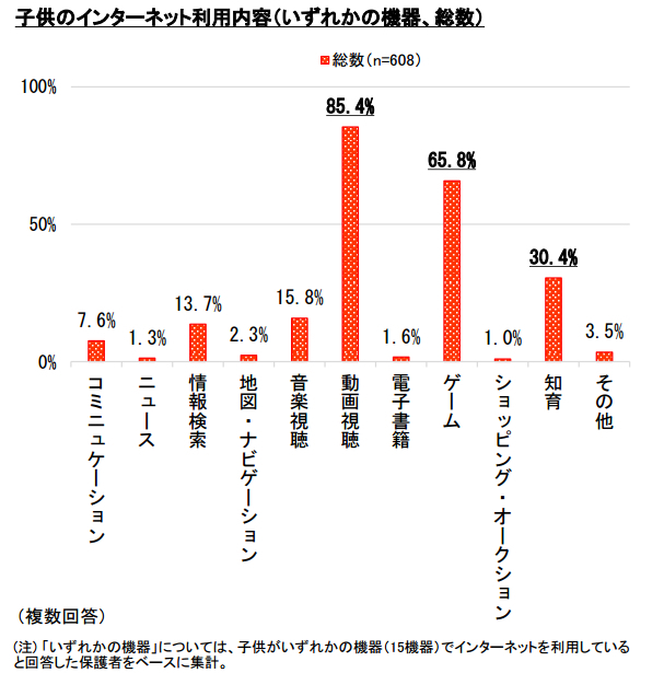 子どもがインターネットでよく利用している内容をきくと、動画視聴(85.4%)、ゲーム(65.8%)、言葉・数遊びなど知育(30.4%)が上位となっており、動画視聴は全年齢で多く、ゲームは年齢が上がると、多くなっている。また、コミュニケーションや情報検索は、6歳までは1割未満だが、7歳から利用する割合が大きく増加。特に、情報検索は7歳は14.8%、8歳は21.1%、9歳は34.4%と、飛躍的に伸びている。