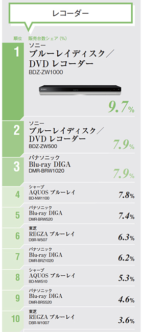 2017年4月のピックアップカテゴリは、「SIMフリースマートフォン」「ノートPC」「4Kテレビ」「レコーダー」「タブレット端末」「液晶ディスプレイ」の6つ。「レコーダー」の1位は、ソニーの大容量1TBの2番組同時録画対応モデル「BDZ-ZW1000」でした。