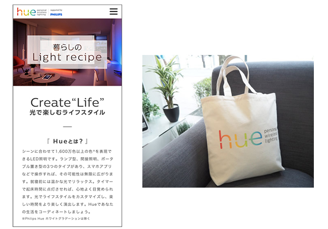 「二子玉川 蔦屋家電」での体験イベントと連動し、イベント参加者が「#hueコーデ」のハッシュタグをつけてInstagramに投稿すると、「Philips Hue」オリジナルグッズのトートバッグがもらえるキャンペーンなども実施する。
