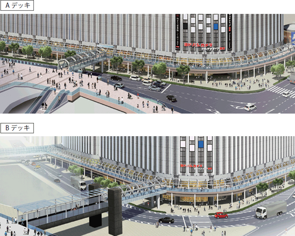 6月30日に、既存のヨドバシ梅田ビルの2階と面した回遊デッキの一部と、同ビルとJR大阪駅 大阪ステーションシティ カリヨン広場を結ぶ「Aデッキ」が完成。回遊デッキの残りと、グランフロント大阪うめきた広場と結ぶ「Bデッキ」も、2017年秋頃をメドに完成する予定。