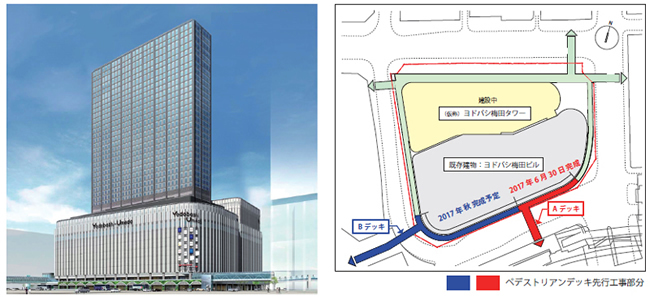 ヨドバシカメラは16年8月に、ヨドバシ梅田ビルに隣接する場所に、地下4階、地上34階建ての超高層複合ビル「ヨドバシ梅田タワー(仮称)」を建設する計画を発表した。竣工は19年秋の予定。その新築工事に先立ち、ペデストリアンデッキの建設工事に着手。一体開発完成時には、歩行者は各主要交通機関や周辺商業施設とスムーズに行き来でき、賑わいの創出、回遊性と利便性の向上が期待できる。