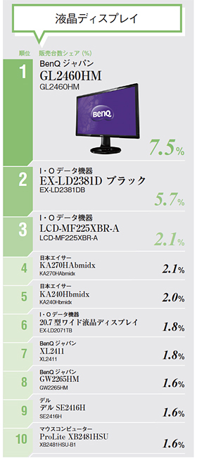 2017年4月のピックアップカテゴリは、「SIMフリースマートフォン」「ノートPC」「4Kテレビ」「レコーダー」「タブレット端末」「液晶ディスプレイ」の6つ。「液晶ディスプレイ」の1位は、BenQジャパンの24型フルHDのフリッカーフリーディスプレイ「GL2460HM」でした。