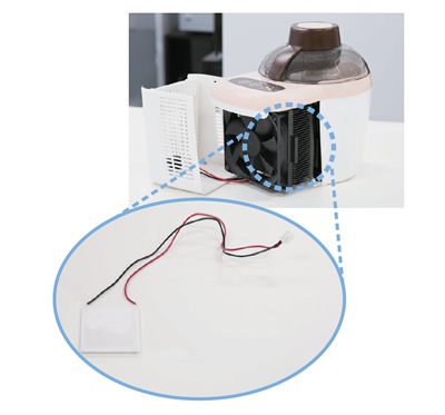 アイスデリの冷却機能に採用しているペルチェ素子は、タイルのような形状で、電気を流すと片方からもう片方へと熱を移動させる仕組みを持つ。冷蔵庫などに搭載するコンプレッサよりも静かに食材を冷やすことができるので、食卓で使用してもテレビの音声や家族の会話を邪魔しない。