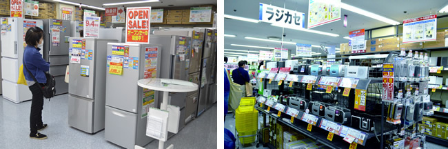 小型・中型モデルを目立つ場所に配置した冷蔵庫売り場(左)と、品数豊富なラジカセ売り場