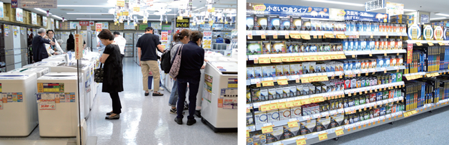 空間にゆとりをもたせた洗濯機売り場(左)。消耗品は充実。各種電球が隙間なく並ぶ