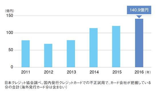 一時期は減少傾向にあったクレジットカードの不正使用被害額が、2012年を底として再び増加に転じた。カードの磁気ストライプ部分に含まれる情報を複製するスキミング犯罪に加え、不正に入手したカード番号をECサイトなどで利用する番号盗用被害が拡大している。日本クレジット協会の調査によると、16年の1年間で、日本国内で発行されたクレジットカードの不正使用額は140億円以上に達したという。