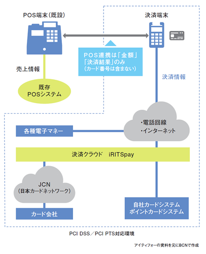 小売業向けの業務システムなどを手がけるITベンダーのアイティフォーでは、このような問題に対する解決策のひとつとして、クラウド型の決済サービス「iRITSpay(アイ・リッツペイ)」の提供を昨年末に開始した。既存のPOSシステムに、ICチップ対応の小型決済端末を追加し、決済時はカード情報を端末から同社の決済クラウドに直接送信する。