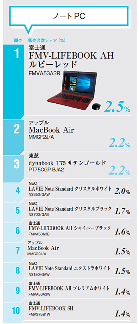 2017年5月のピックアップカテゴリは、「SIMフリースマートフォン」「ノートPC」「4Kテレビ」「アクションカメラ」「プロジェクター」「ホームシアターシステム」の6つ。「ノートPC」の1位は、富士通の「LIFEBOOK AHシリーズ」の「FMVA53A3R」でした。15.6型ワイドフルHD液晶、オンキヨー製スピーカーを搭載したプレミアムモデルです。前月に比べ、シェアは0.1ポイントダウンしたものの、2月、3月に続き、トップに立ちました。「ノートPC」
