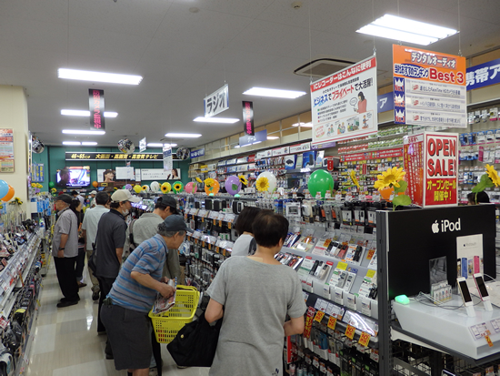 橋本店長の言葉通り、横長のフロアの新店では、入口のすぐ近くに電球や電池、メディアなどの小物の最寄品を並べて、日常的にスーパーに買い物に来る顧客のついで買いを促している。さらに、年配客や学生など一人暮らし世帯を意識し、その先には、シェーバーや理美容機器、歯ブラシ、健康機器など、小型の家電製品を配置した。午前中という時間帯もあり、オープン時は年配客が多く見受けられ、ラジオの売り場も賑わっていたのが印象的だった。