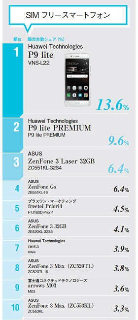 2017年5月のピックアップカテゴリは、「SIMフリースマートフォン」「ノートPC」「4Kテレビ」「アクションカメラ」「プロジェクター」「ホームシアターシステム」の6つ。「SIMフリースマートフォン」の1位は、前月に続き、ファーウェイの「HUAWEI P9 lite」でした。シェアは13.6ポイントにアップ。2016年7月以降、トップを独走しています。