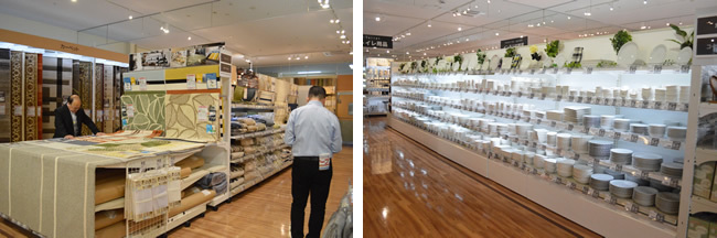 壁沿いの敷物コーナー(左)と、豊富な品揃え食器類コーナー