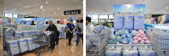 季節柄、寝具コーナーは特に充実。熱吸収や通気性にすぐれた敷パッドや布団セットはオープニングセールの目玉ということもあり、多くの来店客で賑わっていた。ひんやりした素材の抱き枕などを各所に配置し、女性や子どもを意識した売り場づくりの工夫も垣間見えた。