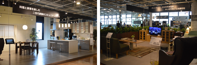 一方、リフォームと家具のフロアである3階はガラリと雰囲気を変え、ラグジュアリーな空間を演出する。最大の特徴は「料理と家事を楽しむ二世代家族のコミュニティ住空間」や「おじいちゃん、おばあちゃんがゆっくり寛げる快適空間」のような分かりやすいキャッチフレーズで、部屋のコーディネートを丸ごとレイアウトしたシーン提案だ。一般の家具専門店であれば、テレビやキッチン家電はモックを利用することが多いが、そこは家電が本業のヤマダ電機。家電も部屋に合う最新モデルをピックアップ。しっかり値札も付いており、セットで提案することが可能だ。