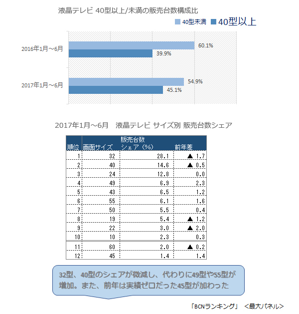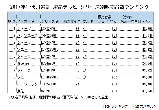 家電量販店・オンラインショップの実売データを集計した「BCNランキング」によると、2017年1月~6月の累計で、液晶テレビのシリーズ別販売台数1位は、シャープの「AQUOS H40ラインの32型「LC-32H40」。販売台数の最も多い一番人気の画面サイズ別は32型で、40型、24型、49型、43型と続く。ランキング上位に入った製品は、標準ハイビジョンまたはフルHDに対応。4K対応モデルは16位のソニーのX8300Dシリーズの49型「KJ-49X8300D」が最上位、平均単価の倍以上の20万円を超えるプレミアクラスの製品は、ようやく41位に登場する状況で、売れ筋は手頃な価格のスタンダードなモデルだ。
