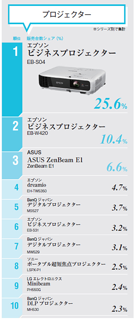 2017年5月のピックアップカテゴリは、「SIMフリースマートフォン」「ノートPC」「4Kテレビ」「アクションカメラ」「プロジェクター」「ホームシアターシステム」の6つ。「プロジェクター」の1位・2位は、エプソンのビジネスプロジェクター「EB-S04」「EB-W420」、3位はASUSの極小プロジェクター「ASUS ZenBeam E1」でした。