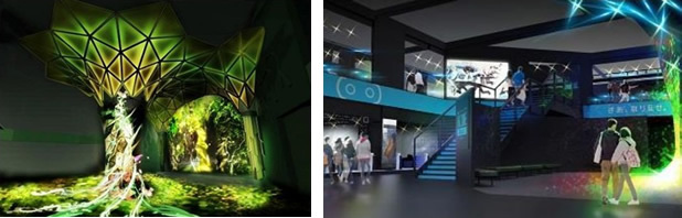 施設の外壁には、東京駅3Dプロジェクションマッピング「TOKYO HIKARI VISION」で注目されたクリエイティブカンパニー・NAKEDとタッグを組み、パックマンが登場するプロジェクションマッピングを使った光の演出を行うほか、施設中心にそびえ立つ「センターツリー」のあるエリアには、照明とプロジェクションマッピングを使った光の演出を行い、壁面に触れることで施設内のエネルギーが感じられるアソビの仕掛けを施し、時間や季節によって映像が変化するエンターテインメント空間を実現した。