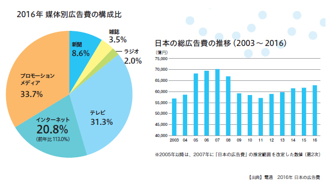 電通の調査によると、日本の広告費はここ2~3年で、微増傾向にある。2016年の総広告費は、前年比101.9%の6兆2880億円。このうち、媒体費と広告制作費を合わせたインターネット広告費は、前年比113.0%の1兆3100億円で、総広告費に占める割合は20.8%に達した。新聞やテレビなどのマスコミ4媒体に比べ、他の分野より伸び率は高く、16年は、媒体費単独で初めて1兆円の大台を超えた。数年前から、従来の紙媒体への広告出稿を取りやめ、オンライン広告中心に切り替えるメーカーも増えている。