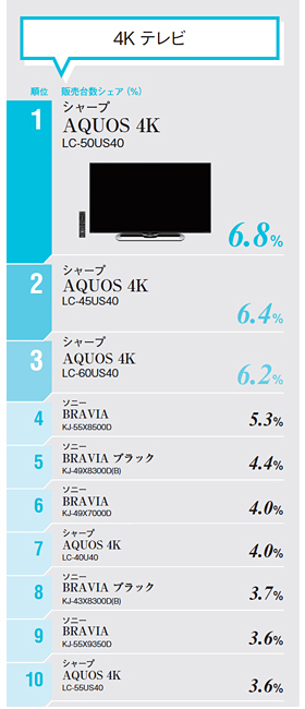 2017年5月のピックアップカテゴリは、「SIMフリースマートフォン」「ノートPC」「4Kテレビ」「アクションカメラ」「プロジェクター」「ホームシアターシステム」の6つ。「4Kテレビ」の1位は、シャープの4K液晶テレビ「AQUOS 4K」の50型スタンダードモデル「LC-50U40」でした。シェア6.8%で、前月の5.9%から0.9ポイントアップしました。