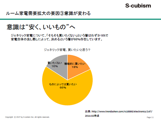 また、薮崎社長は消費傾向と販売環境についても指摘する。「ジェネリック家電が人気を集めているが、消費者は物を購入するときに『安くていいもの』を求める傾向が強くなっている。ブランドにはこだわらなくなってきた。また、かつては街の電気屋だけだった売り場は、量販店、ネット通販と広がり、非マス家電にも居場所ができた」。