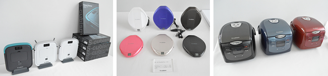 左から今回発表したロボット掃除機、CDポータブルプレ―ヤー、炊飯器
