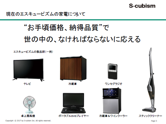 今年で12年目を迎えるエスキュービズムが家電事業を開始したのは4年前。ネット通販事業で自社製品を販売することを目的に開発していたが、現在はリアルの家電量販店を中心に展開している。取り扱うアイテムも多彩だ。液晶テレビやオーディオプレーヤーなどのデジタル家電から、掃除機や冷蔵庫などの白物家電まで幅広く揃える。