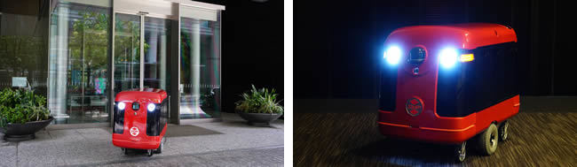 実証実験の第1弾は寿司の宅配。「CarriRo Delivery」の本体に宅配ボックスを搭載し、レーザセンサとカメラによって周囲環境を360°認識しながら、最大時速6kmで自動走行する。夜間の走行を想定し、前方を照らすライトも備える。本体は遠隔監視されており、必要に応じて遠隔操作もできる。最大時速は6km、稼動時間は8時間。