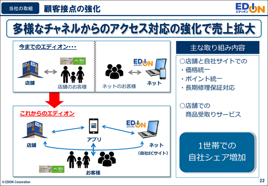 エディオンはEC強化の一環として今年4月、店頭との価格統一を行っていた(17年3月期決算説明資料より)