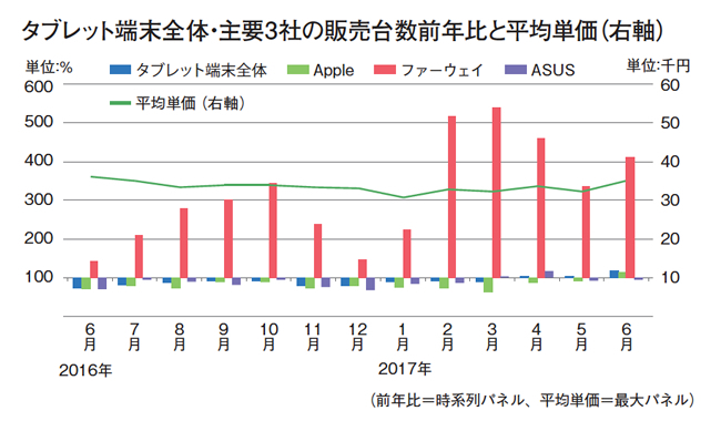 ファーウェイ製品の税別平均単価は2万円台半ばとAppleの半額以下。売れ筋は8インチで2万円前後の「HUAWEI MediaPad T2 8 Pro」と10.1インチで3万円前後の「HUAWEI MediaPad M3 Lite 10」。いずれも質感、完成度、コストパフォーマンスともに高く人気の製品だ。こうしたライバルの登場が市場を活性化させている。(BCN チーフエグゼクティブアナリスト・道越一郎)