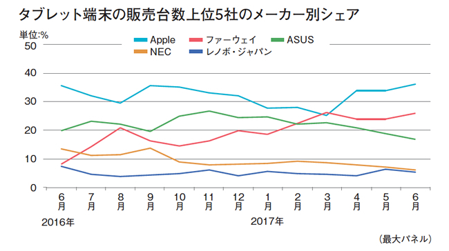 ファーウェイは、今や日本のタブレット市場でAppleに次ぐ第2位メーカーだ。6月でもシェア26.0%と、10ポイント差でAppleに迫っている。しばらくAppleとシェアを競っていたASUSをこの1年で抜き去り、前年比で4倍以上と爆発的に販売台数を伸ばし続けている。