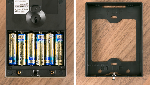単三電池6本で24か月持つ。上下2か所のビス止め部分にビス2本で止めるだけで設置可能