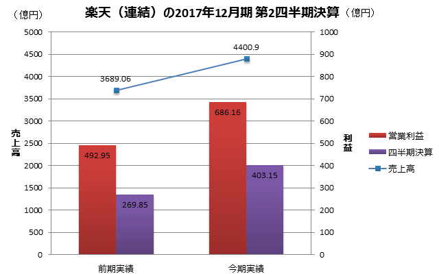 楽天は8月7日、東京・世田谷の楽天クリムゾンハウスで2017年12月期の第2四半期(17年1月1日から6月30日)決算説明会を開催した。連結累計の売上高は約4400億9000万円(前年同期比約119.3%)、営業利益は686億1600万円(139.2%)、四半期利益は403億1500万円(149.4%)で、大幅な増収増益となった。