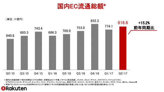 国内EC事業「楽天市場」やMVNOサービス「楽天モバイル」を含めたインターネットサービスの売上高は、3123億3400万円(120.7%)となった。主力の国内ECについては、新規ユーザー獲得のための販促活動や、スマートデバイス向けのサービス強化、楽天エコシステムのオープン化戦略を実施し、好調に伸長。国内EC流通総額は前年同期比115.2%の8166億円となった。