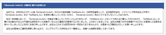 一部の店舗で「Nintendo Switchを単品で購入していただくことはできないが、「SoftBank Air」とセットであればご購入いただけるので、「SoftBank Air」の購入をお勧めする」という説明をする店員がいると、消費者が連絡して発覚したという。
