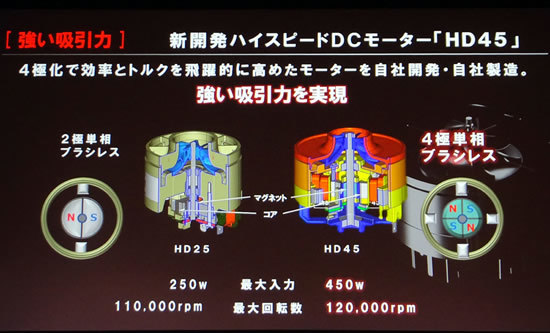 新世代のコードレスクリーナー「VC-NXシリーズ」のコア技術となっているのが、自社で新たに開発・製造した、最大入力450W・毎分12万回転の高速直流モーター「ハイスピードDCモーター HD45」だ。