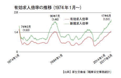 景気を判断する指標の一つ、有効求人倍率は、このところ上昇傾向にあり、2017年6月は前月に比べ、0.02ポイント増の1.51倍(季節調整値)。2か月連続で、1.53倍を記録した1974年2月以来の高水準となった。80年代後半の「バブル景気」時よりも高く、職に就きやすい状況にある。