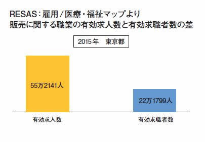しかし、実際には、事務職など、一部の職種・業種に人気が集中し、求人と求職者ニーズが合わない、雇用のミスマッチは大きい。労働環境の良くないイメージが強い販売業は、求職者数が少なく、15年の東京都の場合、有効求人数と求職者数の差は、およそ2倍の開きがあった。