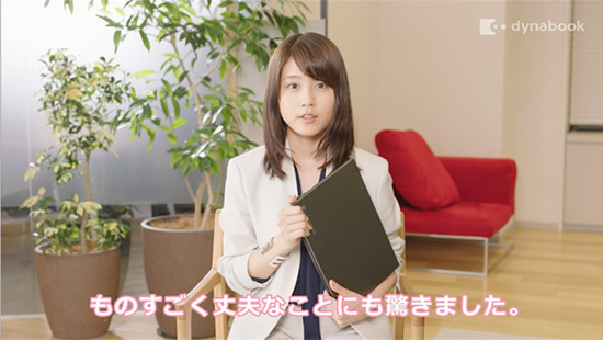「dynabook Vシリーズ」は、女性でも気がねなく持ち歩ける約15.4mmの薄さ、約1099gの軽さ、使い方に合わせて自由に形態を変えられる2in1スタイル、バッテリ切れの心配をなくす約17時間駆動、紙にペンで書くような自然な書きごこちの手書き機能などが特徴。撮影の感想として、有村さんは、「dynabookを持ってみて、薄いことにも驚いたし、片手で持てちゃうぐらい、すごく軽くてびっくりしたんです。実際、CM撮影で落としたときに、ものすごく丈夫なことにも驚きました」とコメントしている。