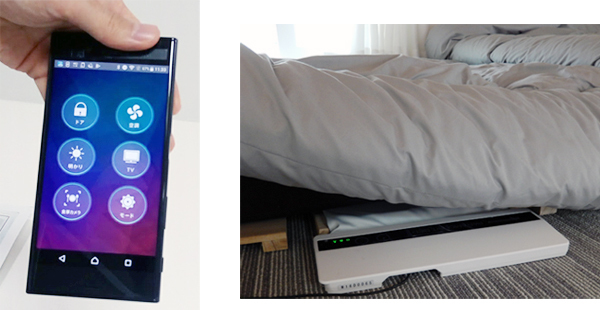 連携するIoT家電などを一括制御できるアプリ(左)と、敷布団の下に引く睡眠計。