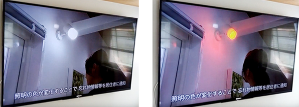 出かける際に忘れ物があると、照明の色が変化して居住者に通知する(イメージビデオより)。