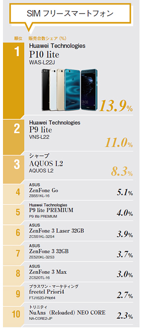 2017年6月のピックアップカテゴリは、「SIMフリースマートフォン」「ノートPC」「4Kテレビ」「ワイヤレススピーカー」「モバイルバッテリ」「ドライブレコーダー」の6つ。「SIMフリースマートフォン」の1位は、ファーウェイの6月9日発売の新モデル「HUAWEI P10 lite」でした。5月はトップだった「HUAWEI P9 lite」も2位につけ、ワンツーフィニッシュを飾っています。