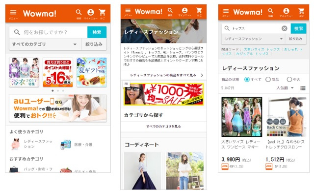今回のリニューアルでは、トップページ、全カテゴリトップページ、検索結果ページのデザインを一新。ユーザーが閲覧した商品カテゴリに応じてレコメンドする商品・コンテンツを出し分けるなど、より欲しい商品が見つかりやすいサイト構造にした。「Wowma!」を利用すると、auユーザーはWALLET ポイント、一般ユーザーはWowmaポイントが貯まる。