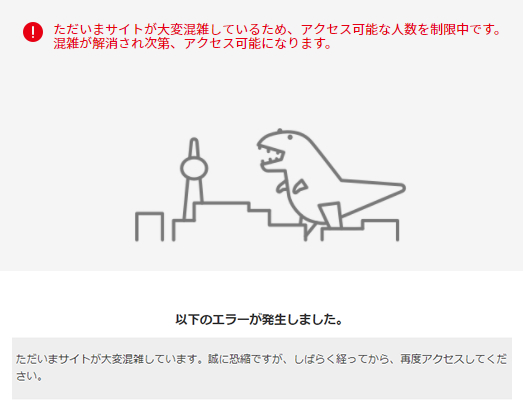 一時は回線混雑のお知らせも通常(上)とは異なっていた(下)